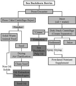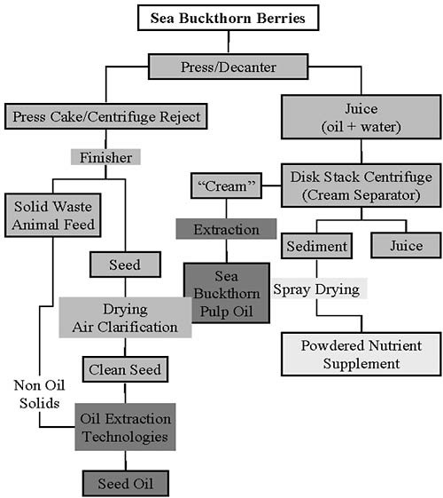 Ακολουθεί ένα διάγραμμα μιας μεθόδου επεξεργασίας η οποία μπορεί να χρησιμοποιηθεί ώστε να διαχωριστούν τα ωφέλιμα τμήματα του καρπού, αποδίδοντας τα βασικά συστατικά του χυμού, αποξηραμένους καρπούς και το έλαιο από την πούλπα και το σπόρο. Τα υπολείμματα μπορούν να χρησιμοποιηθούν ως ζωική τροφή υψηλής αξίας. Νέες τεχνολογίες, όπως η υπερκρίσιμη εξαγωγή διοξειδίου του άνθρακα, χρησιμοποιούνται πλέον στην Κίνα ώστε να παραχθούν έλαια με υψηλή απόδοση.